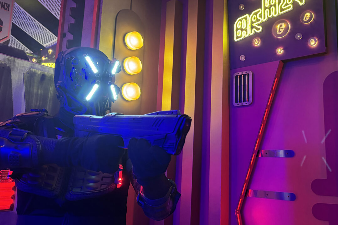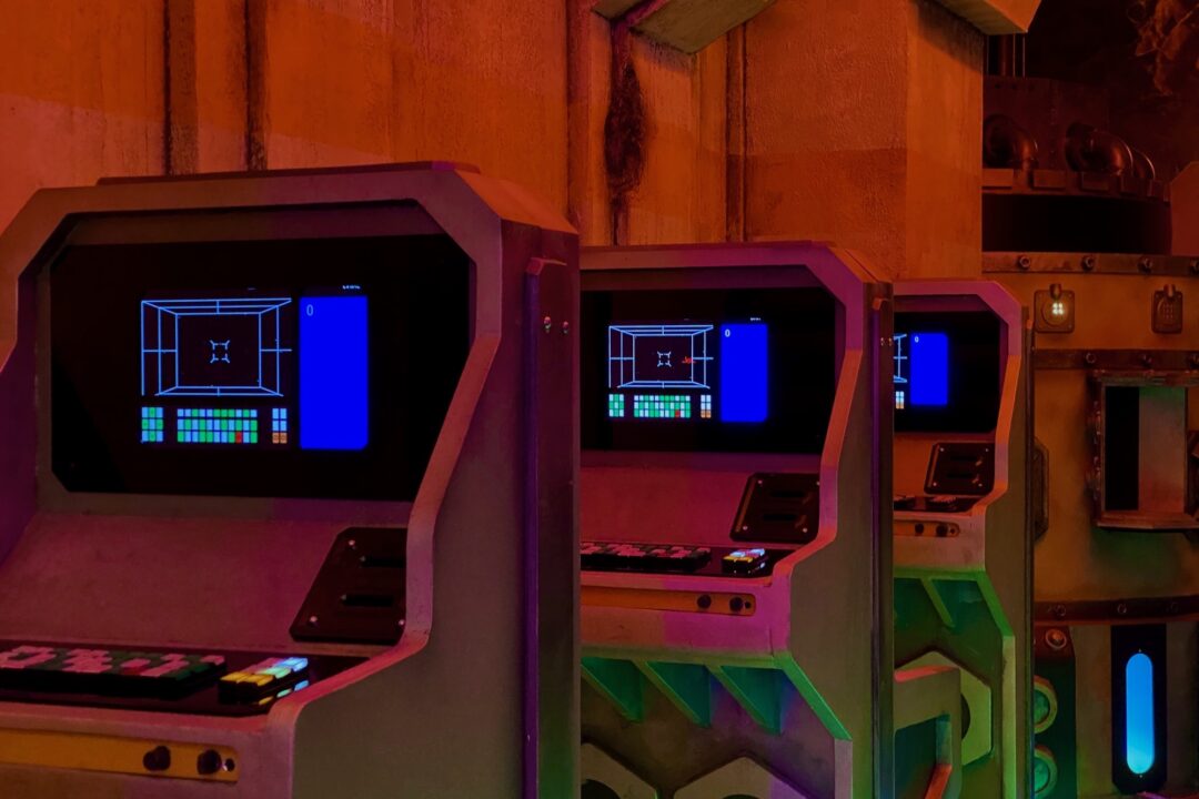 Nous sommes ensuite conduits vers le container, pour le moins sommaire, servant de moyen de transport vers la planète Arkonis. Une petite vidéo, un brief et un fondu au noir plus tard, nous voilà face au premier effet waouh de la salle ! L’arrivée à destination est p*tain de fracassante et nous en met immédiatement plein les yeux ! Nous prenons même quelques minutes pour apprécier la profusion des décors qui nous entourent tant ces derniers sont de toute beauté. Nous avons été propulsés dans une ruelle commerçante où les néons colorés règnent en maîtres ! Exit les stations spatiales épurées aux murs plus blancs qu’un laboratoire d’analyses médicales…