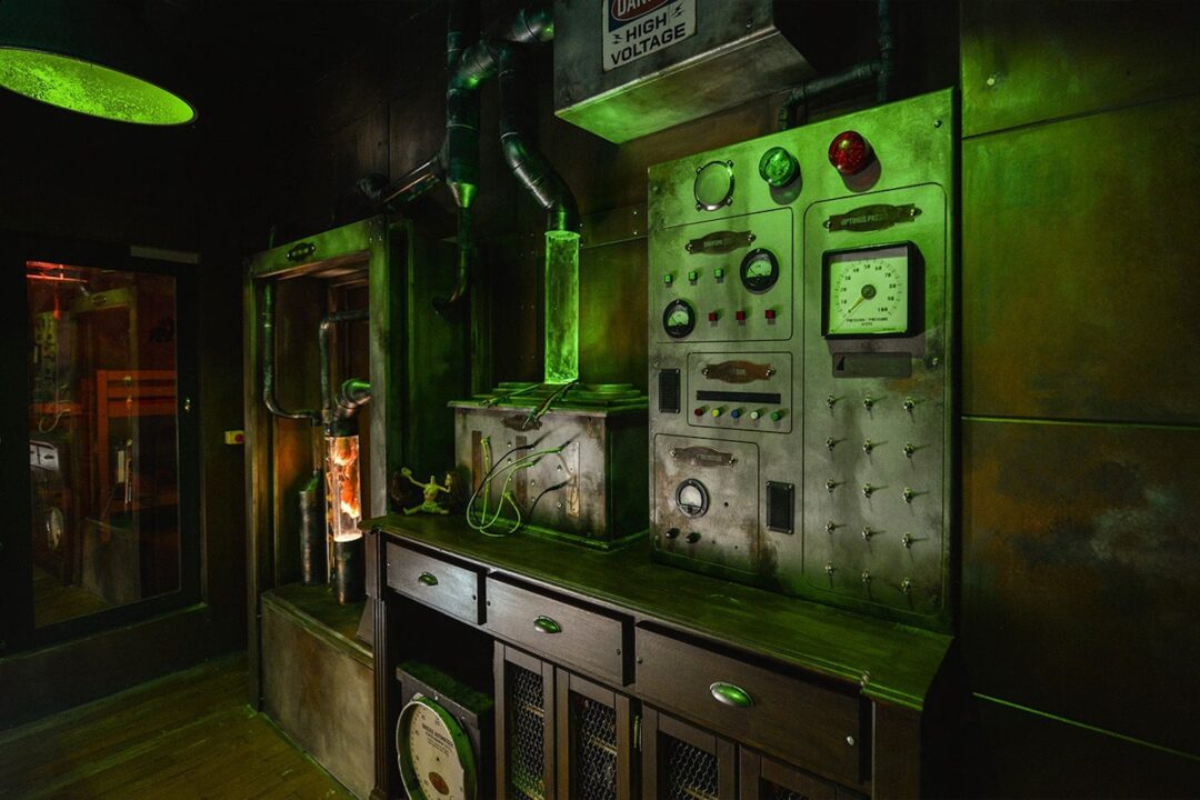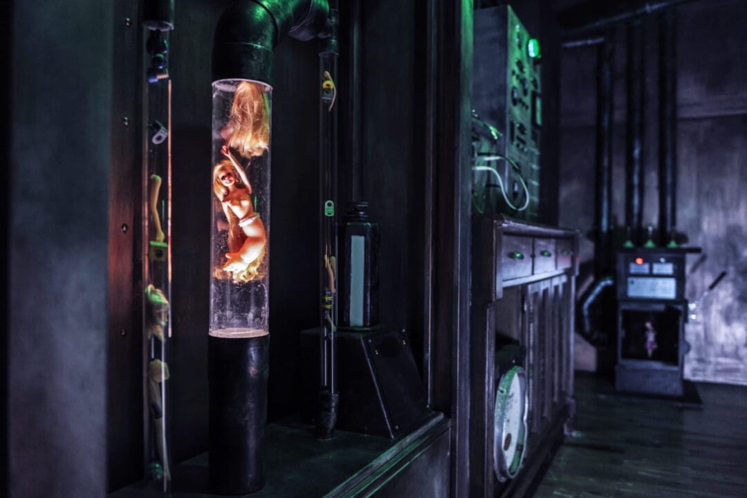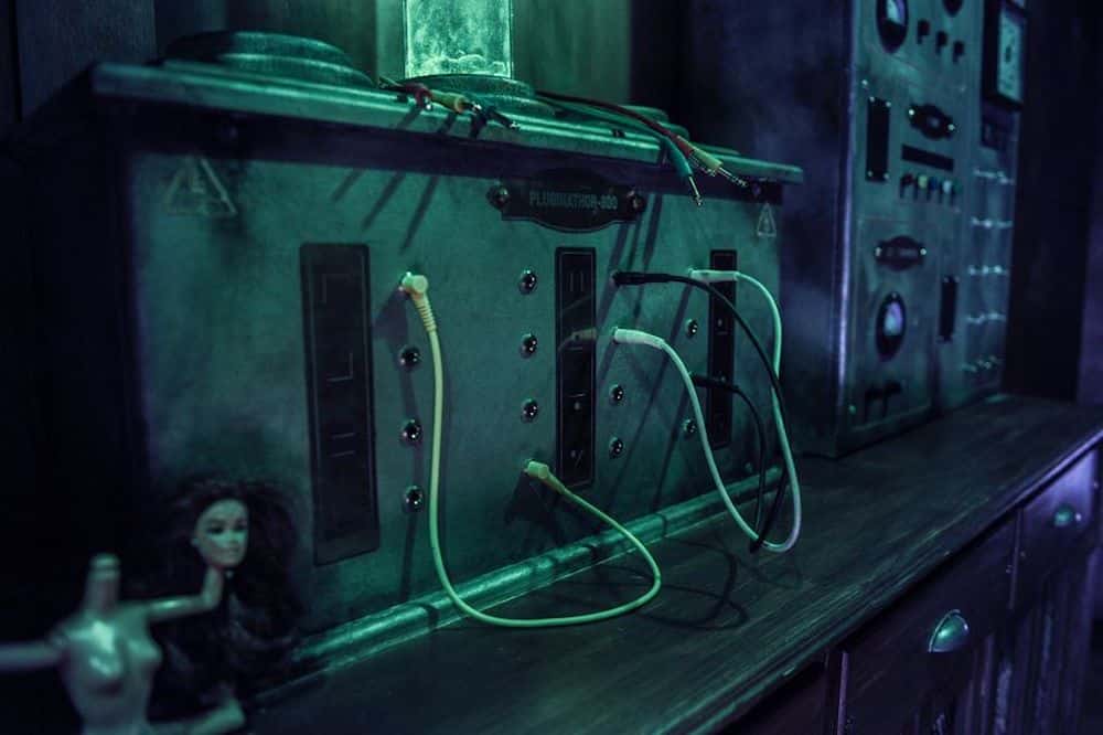 Nouvelle ambiance… Finie la chambre d’enfants et bienvenue dans un lieu aussi étrange qu’étonnant. Une sorte de laboratoire de savant fou qui serait le descendant de Tim Burton !